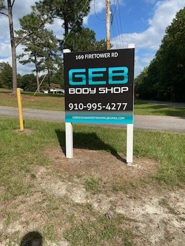 Sign for GEB Body Shop at 169 Firetower Road, with contact number 910-995-4277 and email geebos@gmail.com, located outdoors on grass near a gravel road with trees in the background.